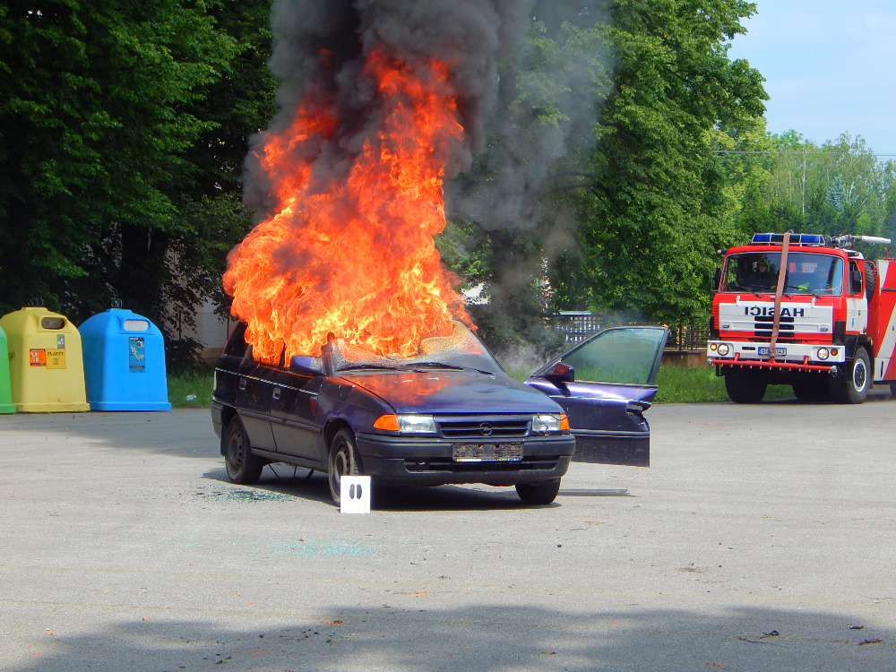 A pak přišlo nejvíc očekávané představení – ukázka požáru automobilu včetně činnosti výjezdové jednotky při jeho lokalizaci a uhašení. Ani dospělý doprovod dětí netušil, jak rychle se velmi silně rozhoří obyčejné osobní auto. Hasiči byli za svůj profesionální zákrok při tomto požáru odměněni potleskem všech přítomných.
